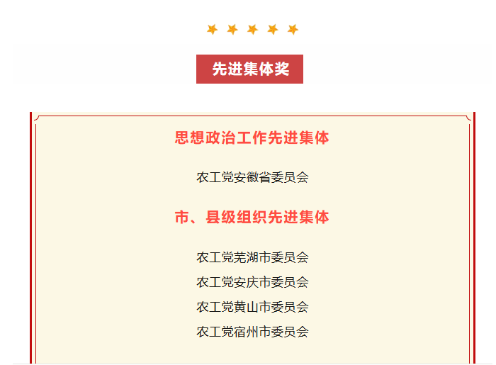 12月20日,中国农工民主党第十七届中央委员会第四次全体会议在京举行。会议对农工党十七大以来在思想政治引领、职能履行和自身建设等方面表现突出的集体与个人进行表彰,共授予319个先进集体和230名优秀个人相应荣誉。黄山市委会在此次评选中荣获“先进集体”称号。