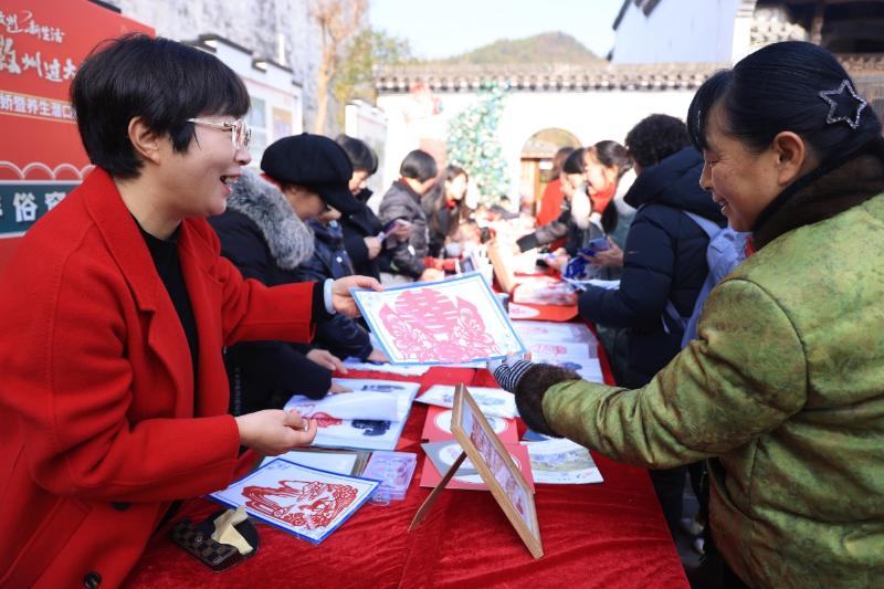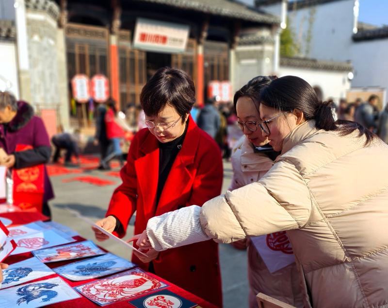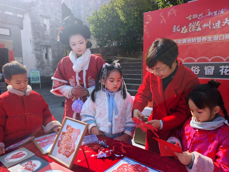 徽州区政协委员、区老年大学剪纸教师程雪飞积极参加志愿服务,经常带领学员深入乡村、景区为乡村百姓和中外游客剪纸送祝福。图为1月24日,程雪飞在该区“中国年 徽州味 就在徽州过大年”徽州年味发布会暨潜口养生腊八节活动现场展示剪纸艺术。